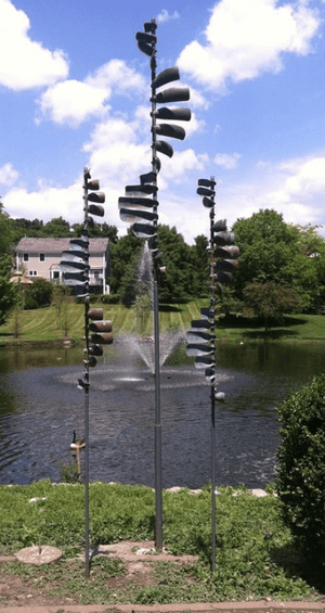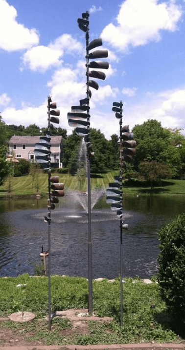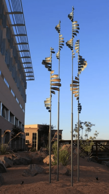 Whitaker’s Wave is as soothing and tranquil as the rhythmic ripples of a majestic sea. The sculptor places flat metallic elements with curved edges across two spinal columns. As the wind sculpture twirls on its axis, its impeccable form and shape come alive.
