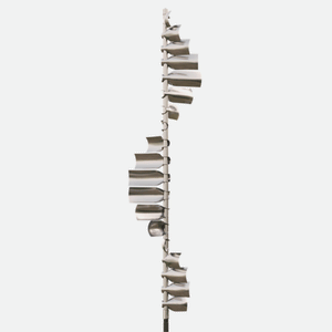 With Wave, Lyman Whitaker translates the rhythm of water into a kinetic masterpiece. The tall, slender form features a vertical sequence of polished blades that move with the wind, evoking the ebb and flow of rolling waves. Crafted from stainless steel, this piece captures both strength and fluidity, shimmering like sunlight on water as it turns.