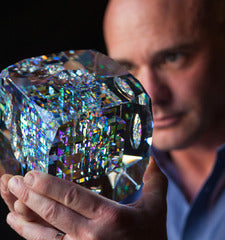 In Purple Teardrop, Jack Storms transforms light into sculpture, creating a breathtaking union of geometry, color, and precision. Handcrafted using his signature cold glass technique, this exquisite work features a cascade of optical crystal and dichroic glass — meticulously cut, polished, and fused into a form that captures the full spectrum of light.