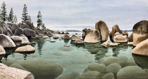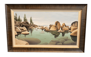 Discover the awe-inspiring landscapes of Tahoe through the Alexander Volkov art collection at Marcus Ashley Gallery. Recognized for his realism paintings, Volkov portrays the district’s sceneries with remarkable detail to achieve faithful representations of his favorite place on earth. These pieces have evolved into a series and are now available in a Collectors Edition of only 25 worldwide. Sand Harbor is a depiction of one of Tahoe’s most popular parks with public beaches. Given the long stretch of the Main Beach, it must have been a challenge for Volkov to find a cove of boulders and rocks to paint. But here it is, and the effort is more than worth the replication for viewers who have not been as fortunate to visit the famous destination. The artist transposes Sand Harbor’s sublime beauty onto his canvas, from a viewpoint not commonly seen in tourist brochures and photographs. In Volkov’s eyes and through his paintbrush, the setting becomes dramatic with an overcast sky, gray stones, and deep green waters.