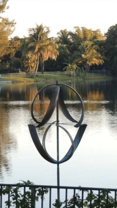 One standout creation is Whitaker’s Meridian, a stunning interpretation of the geographical prime meridian—the line at 0° longitude that divides the earth into eastern and western hemispheres. Much like the equator’s balance between north and south, this sculpture achieves perfect harmony through its design. Twisted metal arches curve over and under a spinning central element, with the lower half mirroring the upper in an inverted reflection. As the sculpture turns, its copper and blue metallic forms align to create fleeting semi-circles, forming a cohesive visual rhythm that changes with every breeze.