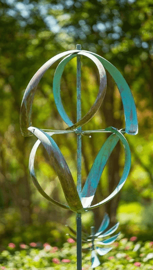 Perfect for gardens, patios, and open landscapes, Meridian is an outdoor kinetic wind sculpture that adds a refined yet organic focal point to any space. The warm copper tones paired with cool patina blues evoke both earth and sky, making it an art piece that connects deeply with nature.