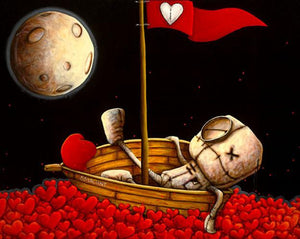 In Afloat on Waves of Desire, Fabio Napoleoni paints love as buoyant and moonlit. Deep crimsons and inky blacks frame warm, diffused light around Marcenivo and the moon, while the SS Valiant carries our giddy rag doll across a sea of hearts. Even the stars give way to tiny red hearts pulsing through the night sky—because when you’re in it, love is everywhere.