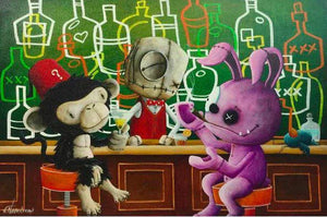 In Booze Therapy, Fabio Napoleoni brings humor and heart together in one unforgettable scene. Set against a glowing backdrop of outlined bottles, Marcenivo tends bar while two familiar companions—Frank and Bunny Boozehound—share drinks and conversation. It’s Napoleoni’s whimsical take on the idea that sometimes the best therapy is laughter, good company, and a splash of something strong.