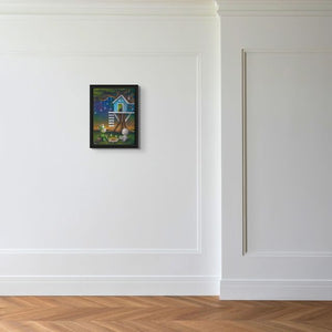 Ideal for a family room, reading nook, or cabin getaway, this giclée radiates comfort and camaraderie. Shown here in a simple black frame for display purposes; the piece does not come framed. A variety of custom framing options are available for an additional charge through the Marcus Ashley Gallery, allowing you to tailor the artwork to your space.