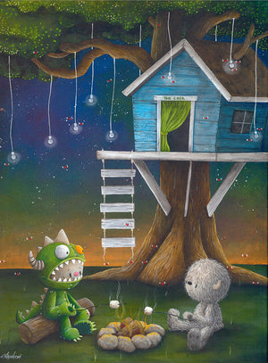 A whimsical treehouse sits nearby—a makeshift lair for adventures yet to come. With its blend of rich colors, comforting values, and Napoleoni’s trademark emotional storytelling, Campfire Chat captures the childlike innocence, wonder, and freedom that define his work.