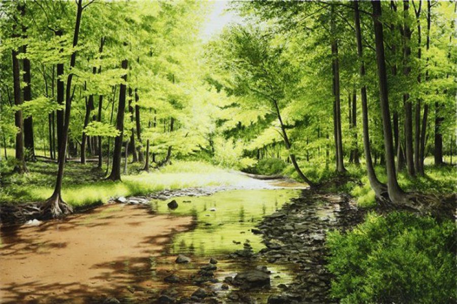 In The Summer Solstice, Alexander Volkov captures the lush height of the season—when sunlight floods the forest and the world feels endlessly alive. Dappled shadows stretch across a shallow creek, while the vibrant greens of late June shimmer in the stillness. Every detail, from the rust-colored earth to the delicate reflection in the water, is rendered with Volkov’s unmatched sensitivity to light and atmosphere.