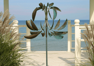 Fleur-de-Lis by Lyman Whitaker features a crown of swirling metallic petals that rises gracefully from its axis to form the iconic lily shape. Each element is meticulously handcrafted at Whitaker’s Utah studio, showcasing his signature blend of mechanical precision and organic elegance. Designed to spin with the gentlest breeze or a strong gust, this wind sculpture is both a captivating focal point and a meditative presence for any outdoor space. Fleur-de-Lis blends beautifully with seasonal blooms and open landscapes, making it ideal for expansive gardens, estates, or community spaces.