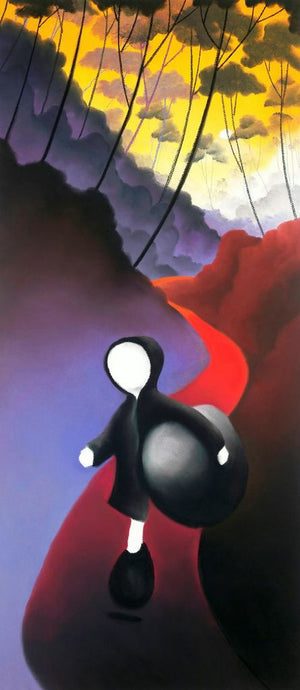 A winding red lane, tall whispering trees, and a small traveler with a heart full of courage— Bends in the Path is a limited edition giclée by Mackenzie Thorpe that celebrates the bravery it takes to keep going when the road turns.