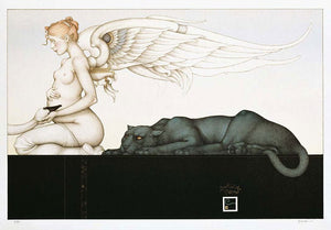 Limited Edition Stone Lithograph A moment suspended in time, Waiting by Michael Parkes is a masterful composition of patience, power, and quiet contemplation. This exquisite stone lithograph captures the delicate tension between strength and stillness, between the seen and the unseen, as its subjects exist in a world of serene anticipation. A luminous, angelic figure kneels in tranquil reflection, her ethereal wings unfurling behind her like whispers of destiny. With one hand gently placed upon her abdomen and the other reaching out to a swan, she appears to be in deep communion with the universe, waiting for something unseen yet inevitable. Beside her, a black panther—a symbol of mystery, protection, and latent power—lies in watchful repose, its golden eyes glowing with quiet intensity. Together, they form a striking contrast: light and shadow, vulnerability and strength, surrender and control. With its intricate details, symbolic depth, and Parkes’ signature dreamlike elegance, Waiting is more than a work of art—it is an exploration of fate, patience, and the profound beauty found in the moments in between. A must-have for collectors who appreciate thought-provoking and evocative imagery, this lithograph will bring a sense of intrigue, grace, and quiet power to any space.
