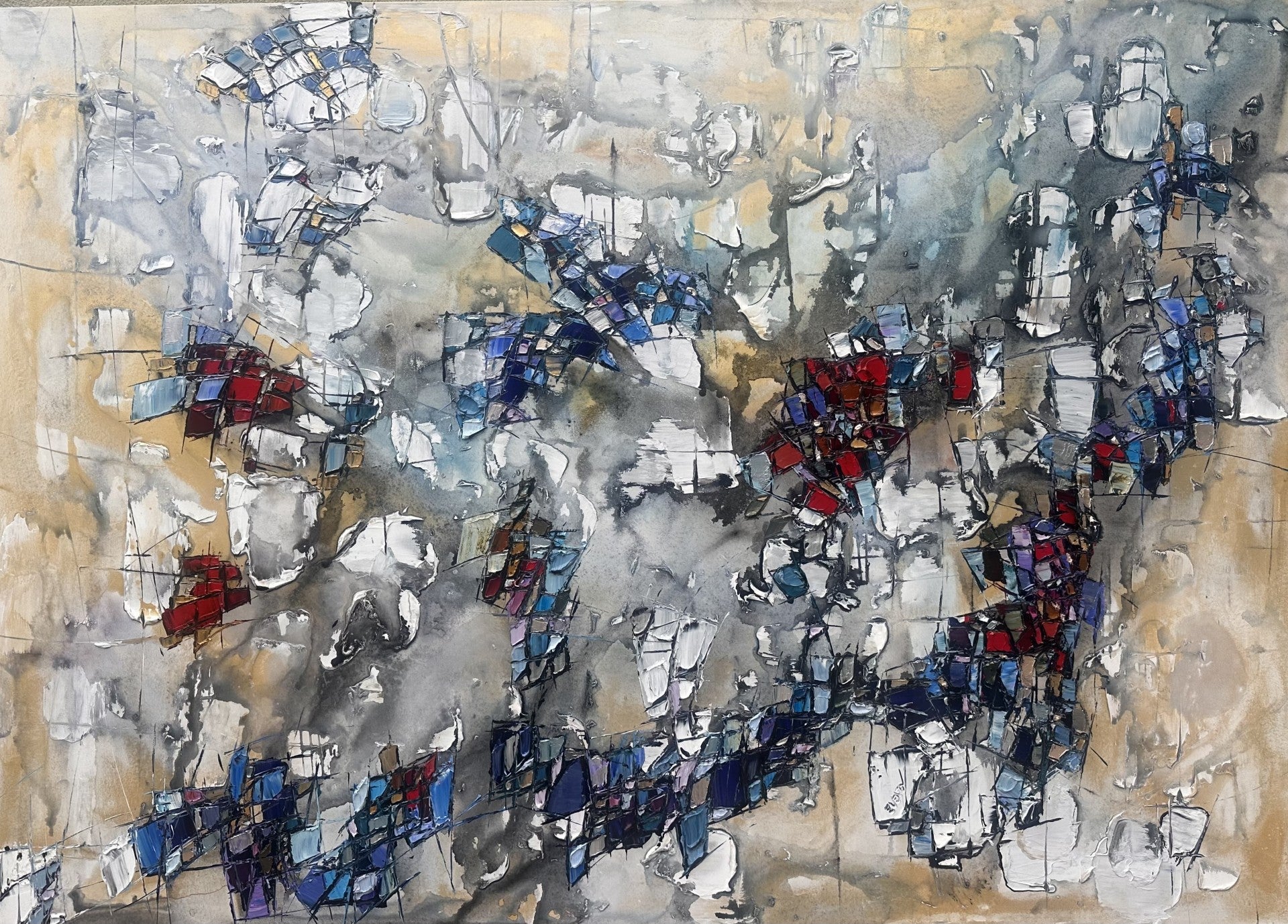 With a palette knife, Eventov layers deep indigos, fiery crimsons, and shimmering silvers across a smoky, neutral backdrop. The fractured, mosaic-like shapes appear to hover and shift, creating a rhythm that feels both structured and spontaneous. Each stroke builds depth and dimension, inviting the viewer to find movement, energy, and even emotion in the interplay of hues.