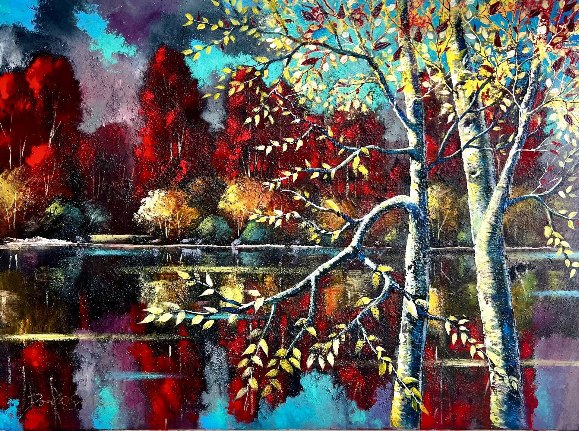 Those saturated reds and golds aren’t whispering fall… they’re shouting it. The electric blues crack through the canopy, the reflections double the drama, and those luminous birch trunks pull you straight into the scene. It’s classic Ford Smith—high contrast, heavy texture, and color that hits you in the chest before your brain can catch up.