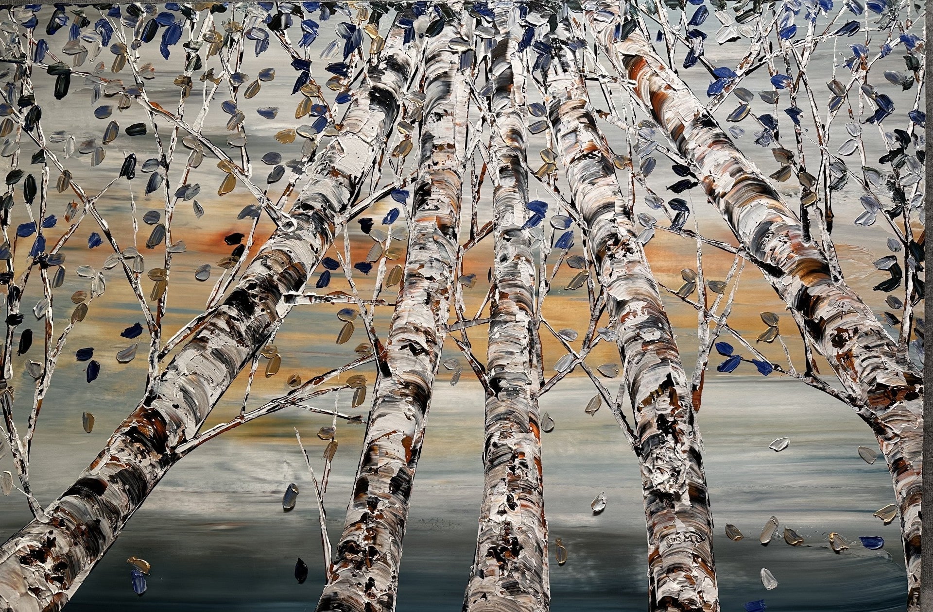 Maya Eventov’s Looking Up Grey (189185) draws the viewer into a soaring perspective, inviting you to gaze skyward through a stand of majestic birch trees. Painted with her signature palette knife technique, the thick, textural strokes bring bark, branches, and scattered leaves to life with remarkable depth.