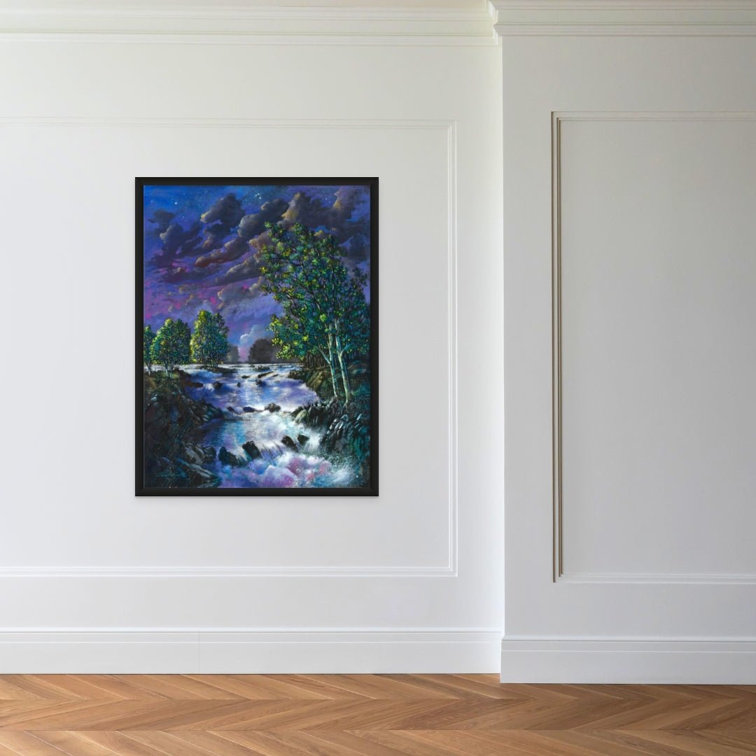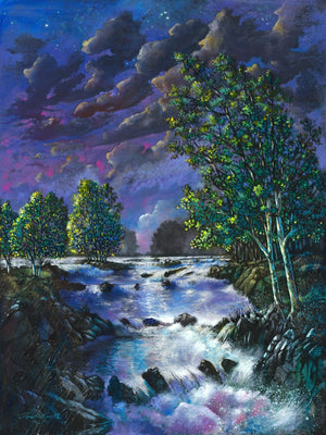 That river doesn’t just flow, it moves. Moonlit blues and silvery whites crash over the rocks, while the sky hums with purples, indigos, and quiet stars peeking through the clouds. The trees glow just enough to guide you forward, like they know something you don’t… yet.