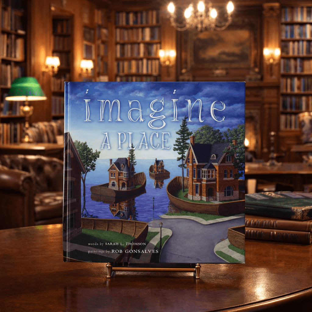 Imagine a Place is a visual invitation to slow down and wander. Paired with the dreamlike paintings of Rob Gonsalves, Sarah L. Thomson’s poetic words guide readers through worlds where architecture floats, logic bends, and imagination takes the lead. Each spread reveals a new moment of quiet wonder—part story, part visual puzzle—encouraging readers of all ages to look twice and think differently.