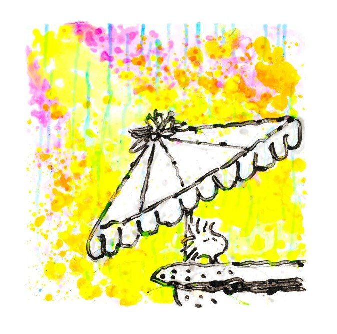 Lagoon Lullaby IV brings the series to a golden crescendo — a warm, sun-drenched dream where stillness glows with life. Beneath a bright umbrella, the small figure basks in color and comfort, surrounded by a shower of lemon yellows, turquoise drips, and pink bursts that feel like laughter in paint form.