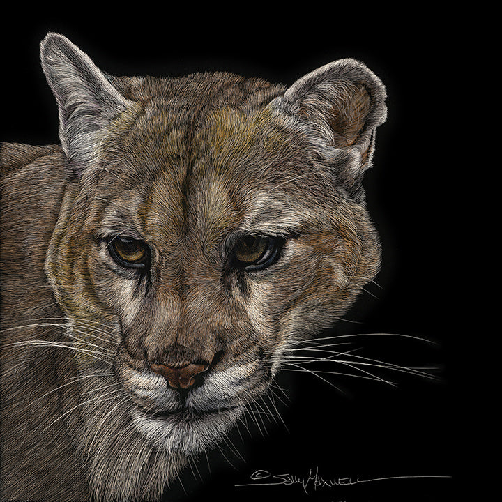 Scratchboard leaves no room for shortcuts, and Maxwell uses that precision to devastating effect. Each line builds depth, muscle, and emotion. The fur feels touchable. The gaze feels personal. Against the deep black ground, the cat emerges with sculptural clarity, almost floating forward into your space.