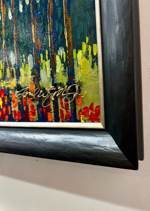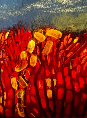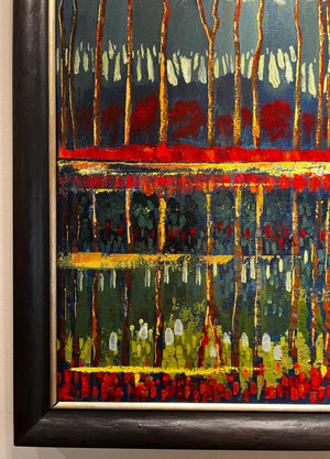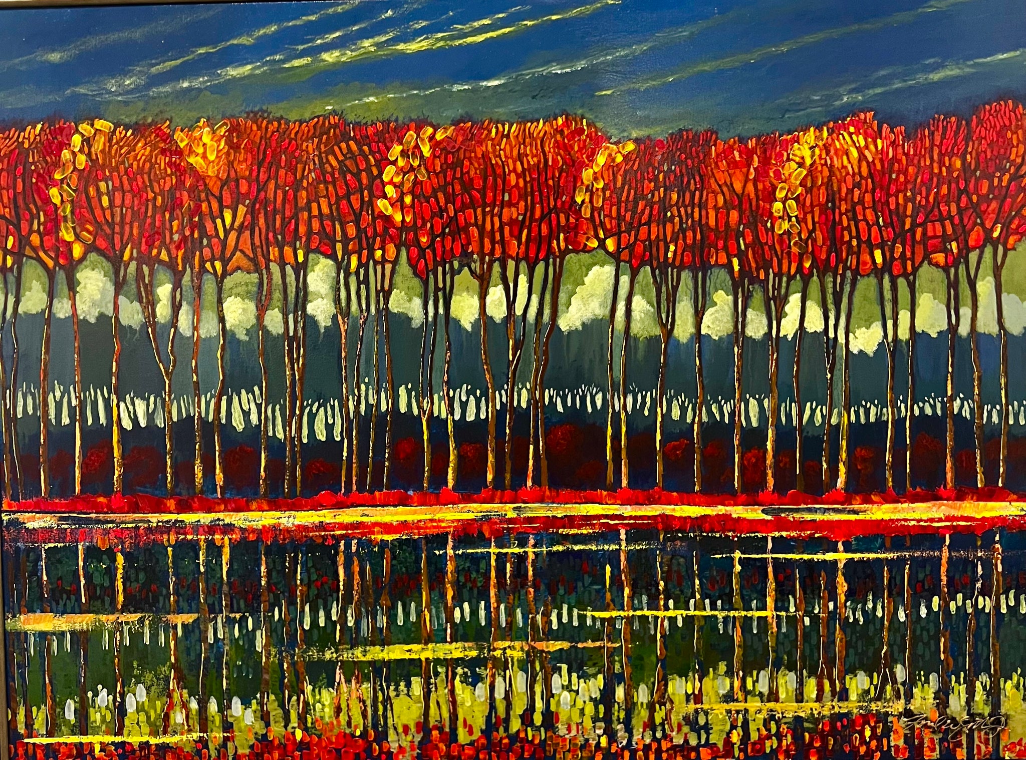A glowing line of fiery red trees stretches across the canvas, mirrored perfectly below like a pulse running through the landscape. Thick texture, confident lines, and saturated color give this piece real presence—it doesn’t whisper, it hums. There’s structure, repetition, and just enough abstraction to let your eye keep moving.