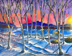 This original acrylic on canvas balances calm and energy beautifully. It’s peaceful, but not quiet—warmth and cool living side by side. A perfect piece for anyone who loves winter landscapes with a little drama and a lot of soul.