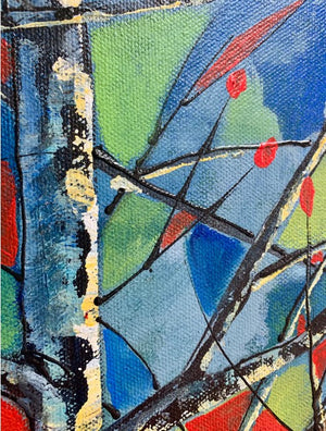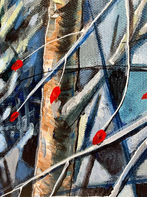 Brilliant reds and icy blues collide beneath a glowing horizon, framed by delicate, silver-lined trees that feel almost etched into the canvas. The fractured color and bold contrast give the piece its harlequin edge—playful, dramatic, and full of movement—while the frozen path pulls you straight into the scene.