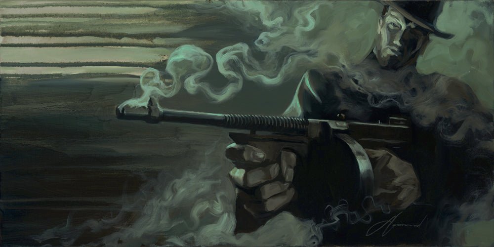 The piece radiates cinematic drama—Leonard’s signature brushwork capturing motion, smoke, and mood in one hypnotic sweep. Each wisp of light and vapor feels alive, curling around the figure as if reluctant to let him go. The result is a moment of raw storytelling—a collision of violence and grace suspended between darkness and redemption.