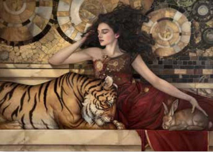 In The Balance, Michael Parkes masterfully captures the fragile harmony between power and peace. A woman draped in deep crimson reclines beside a sleeping tiger and a gentle hare — three spirits united in perfect equilibrium. The mosaic backdrop glows with golden geometry, echoing the eternal rhythm of strength, beauty, and compassion intertwined.